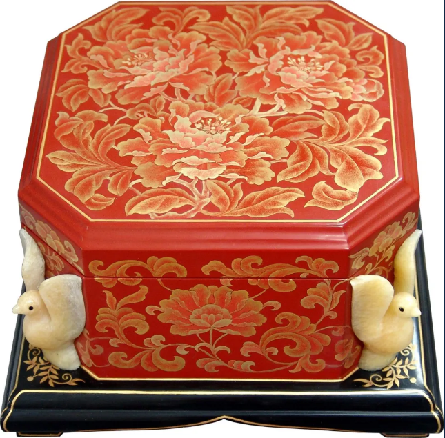 作品以中国吉祥八宝为主题,以红和黑为主色调,以皇家宫廷银锭为造型风格,寓意祈求平安吉祥和富贵幸福。盒的上面采用镶嵌工艺,在髹制规整的锦地上镶嵌玉、石、螺钿、石决明等名贵材料,雕刻精细。漆盒的外框以传统雕填工艺制作,在髹好漆的胎上,彩绘出莲枝花纹,再以勾刀雕刻后戗金和填彩。漆盒色彩丰富艳丽,雕刻细腻精致,古朴优雅、富丽堂皇。