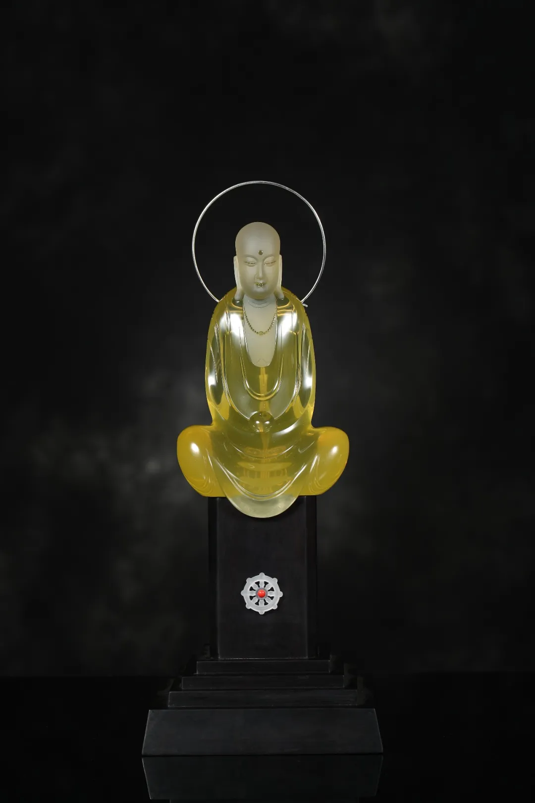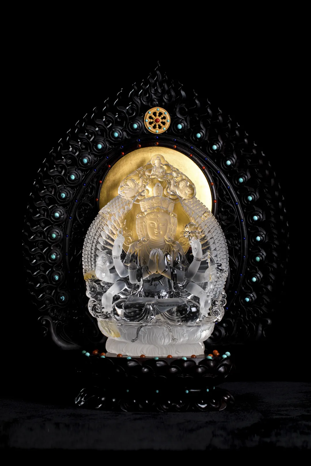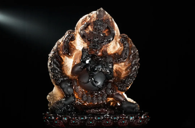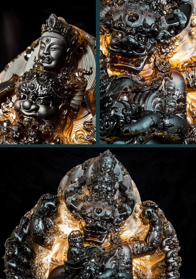 天然茶晶雕刻《大威德金刚》将水晶与佛教文化相融合,采用虚实兼备的雕刻技法,圆雕、浮雕、立体雕、线刻等融为一体的雕刻手法,亮光、亚光、磨砂为一体的抛光技巧,将威德形象展现的栩栩如生。作品构思精巧,格局宏大,工艺精湛,极富有艺术价值和审美价值。