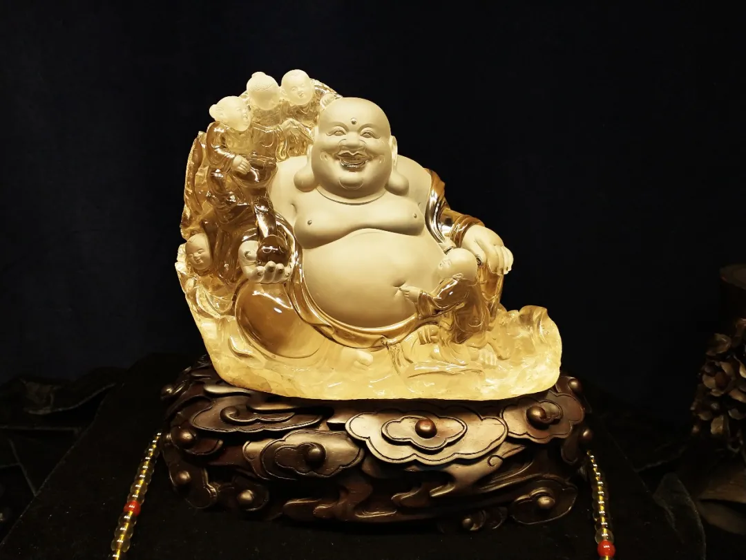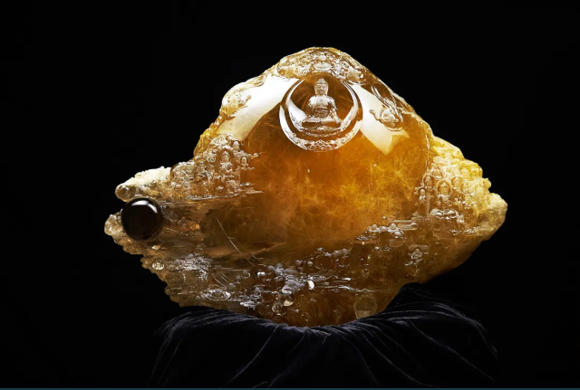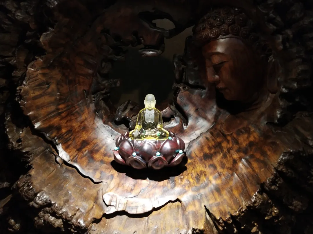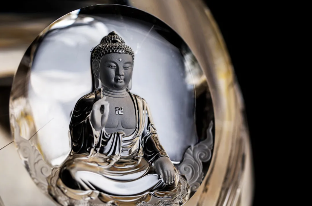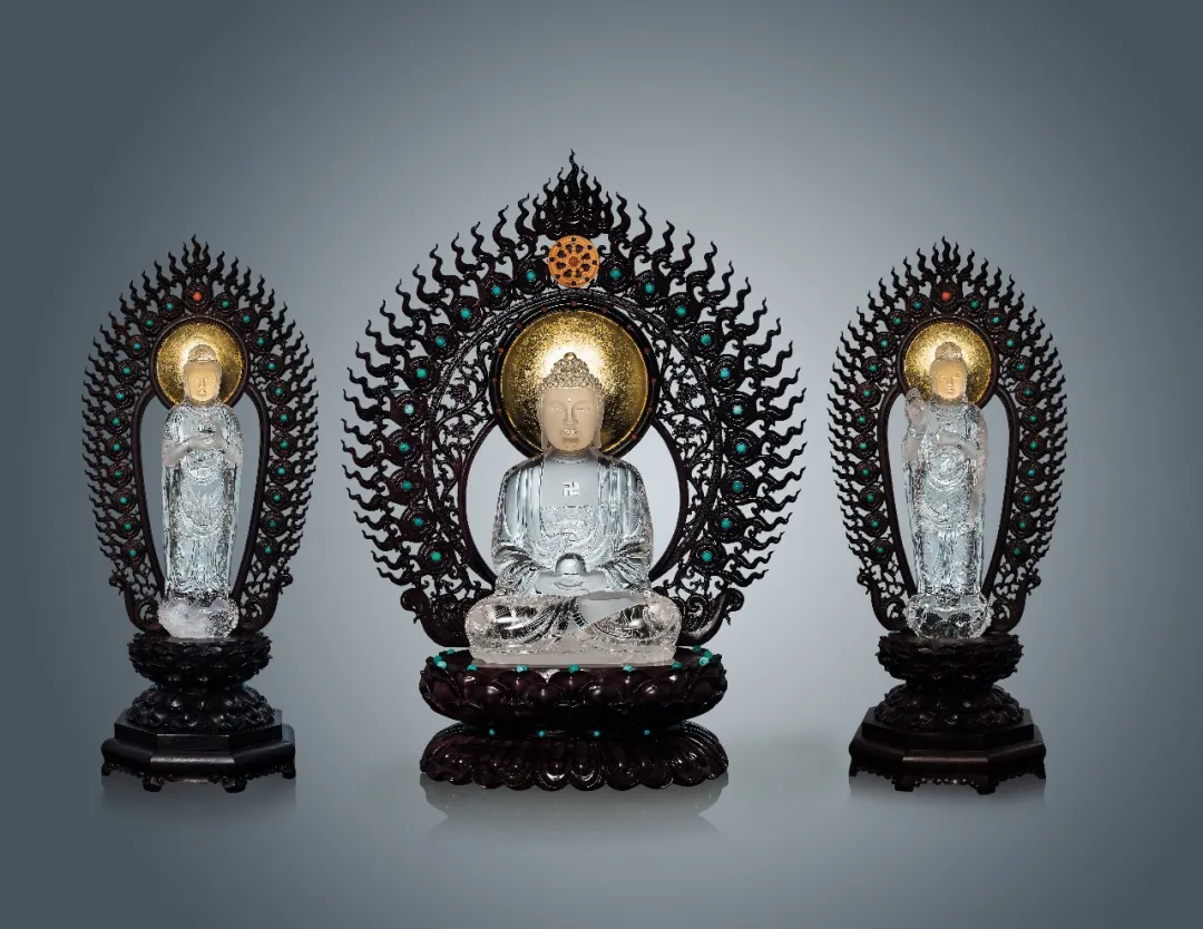 天然茶晶雕刻《大威德金刚》将水晶与佛教文化相融合,采用虚实兼备的雕刻技法,圆雕、浮雕、立体雕、线刻等融为一体的雕刻手法,亮光、亚光、磨砂为一体的抛光技巧,将威德形象展现的栩栩如生。作品构思精巧,格局宏大,工艺精湛,极富有艺术价值和审美价值。