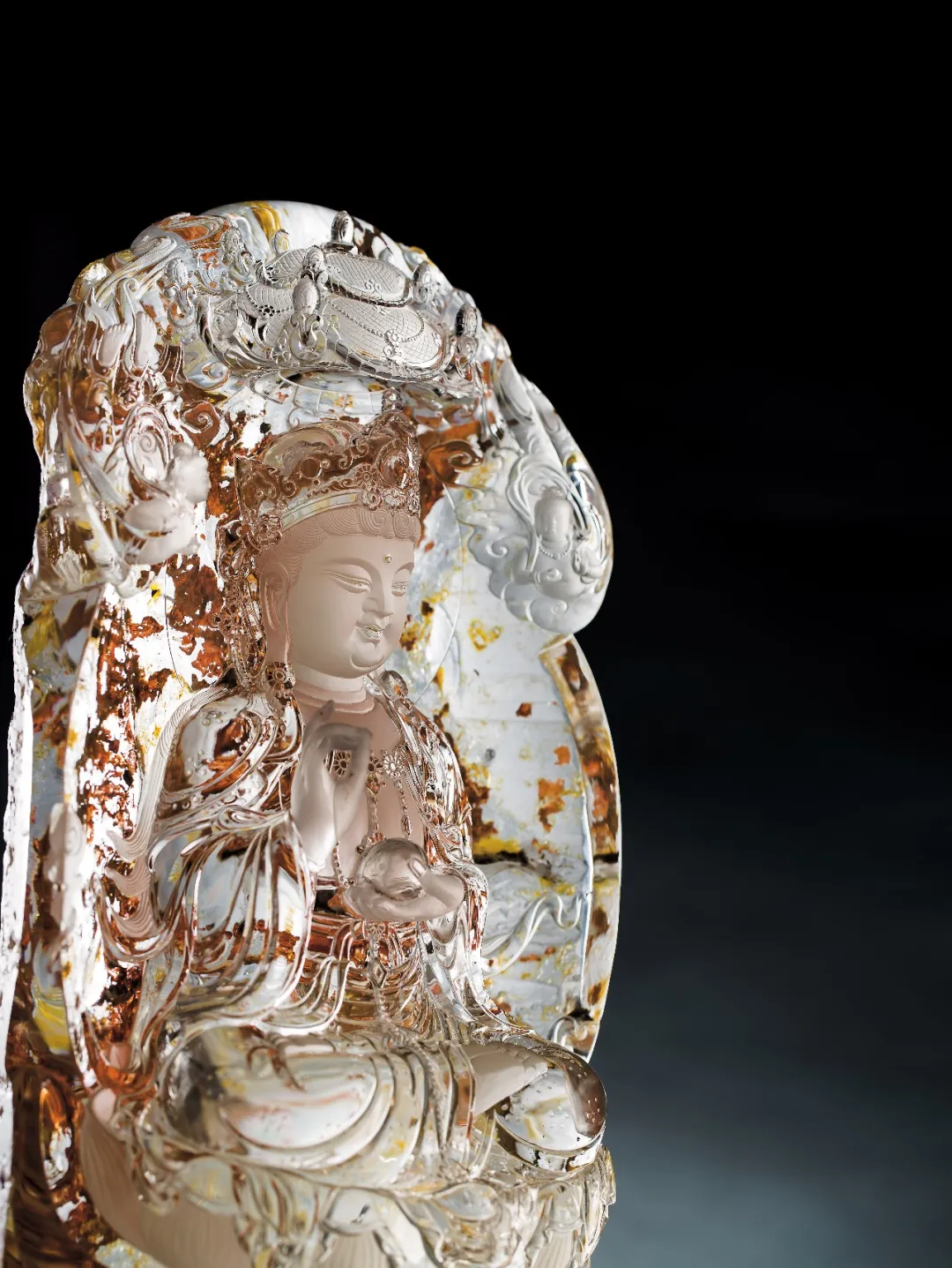 作品采用天然发晶水晶雕刻而成,水晶整体状似一颗大宝钻,其内部天然形成五种颜色的发丝,整齐排列,呈现出迸发向上的形状,十分稀有。作者为最大保留材质的原料美,而采用了大量留白手法,只在材料上半部雕琢佛像,与水晶材质的独特之处完美结合,营造出无边的气势。