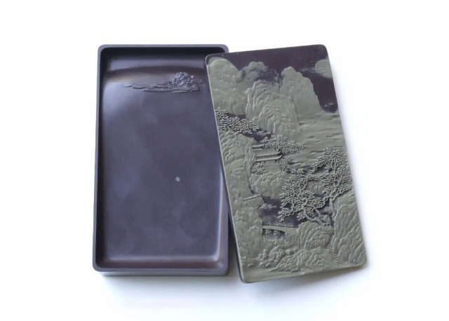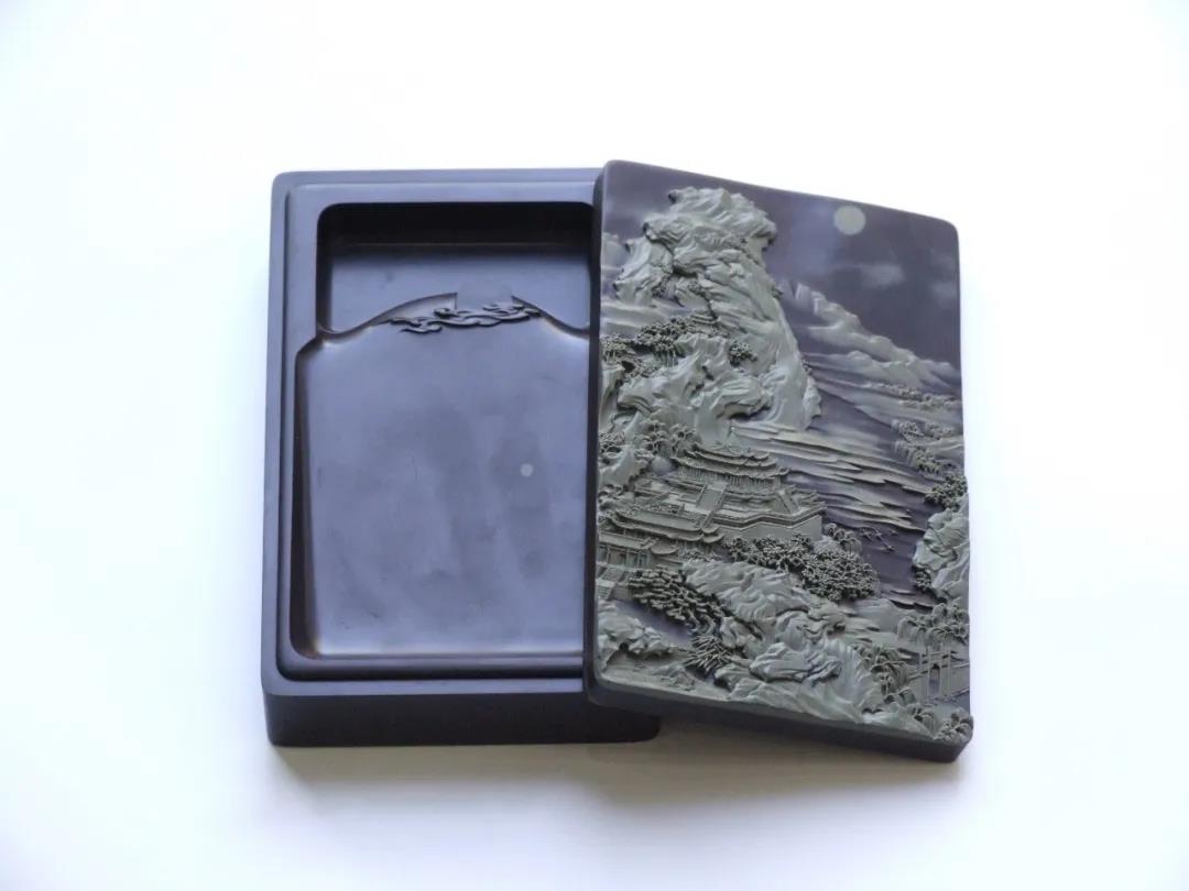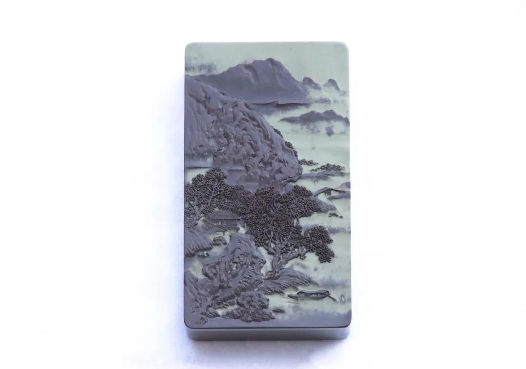 主砚与砚盖均采用贺兰石老坑砚石,石质细腻温润,品质极佳。作品题材参荐清代画家袁江的《骊山避暑图》,整体雕刻工艺精细入微,画面栩栩如生,层次分明;主砚堂内的明月与祥云安然祥和。作品立意以小见大,在有限的空间雕刻出宏大的场景,意境深远,实用性、观赏性与艺术性俱佳。