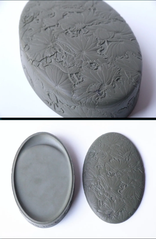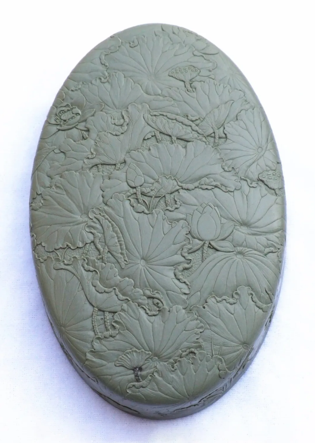 作品选用优质贺兰石老坑砚石,用料讲究。砚盖与砚底精选绿色贺兰石精雕荷叶与荷花,雕工精细,疏密有致,郁郁葱葱。以“荷气一塘”为名,寓意和气一堂,欲表达和和美美、祥和吉利之意。
