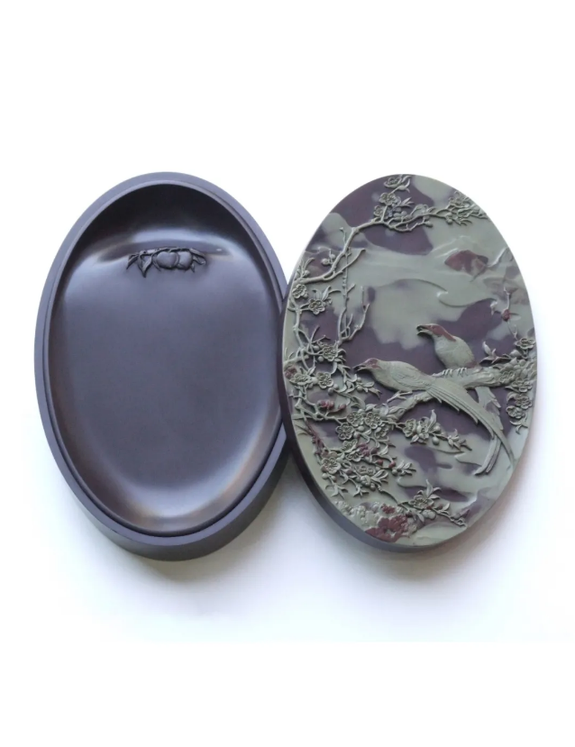 作品选用宁夏贺兰石优质砚石,主砚石质细腻嫩滑,砚盖根据砚石红钢夹绿彩的层次,雕刻了两只山雀在桃林中嘻戏的场景。贺兰石的石质在红钢和绿彩俏色的运用上得到了很好的体现,整件作品意境丰满,雕工精美,刻画了桃花盛开后生机勃发,鸟儿喜庆愉悦的欢快场景。