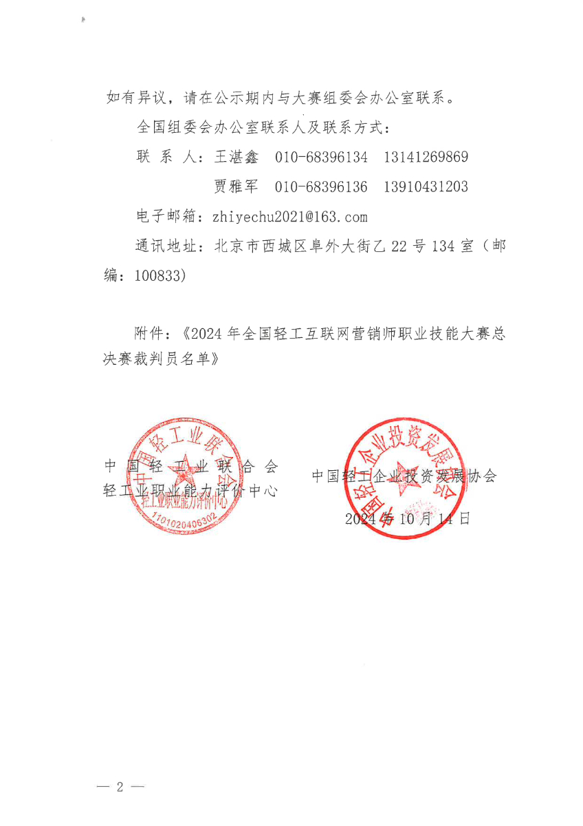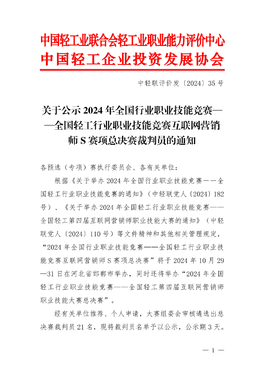 关于公示2024年全国轻工行业职业技能竞赛互联网营销师S赛项总决赛裁判员的通知