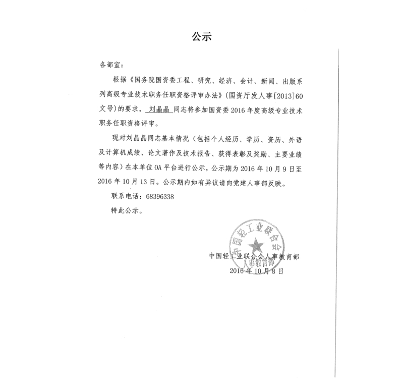 刘晶晶参加国资委2016年度高级专业技术职务任职资格评审公示