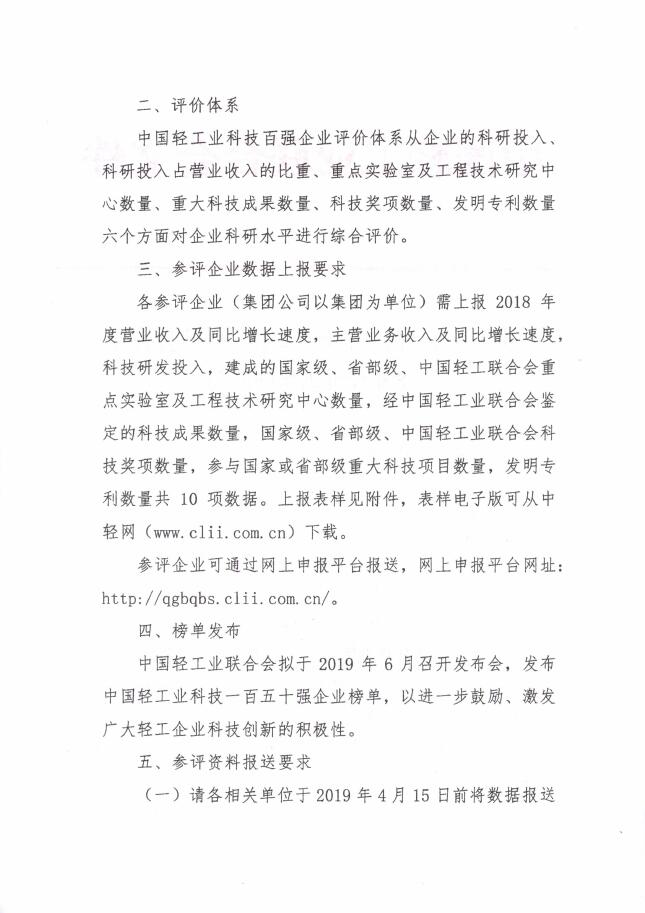 关于开展2018年度中国轻工业科技百强企业评价工作的通知