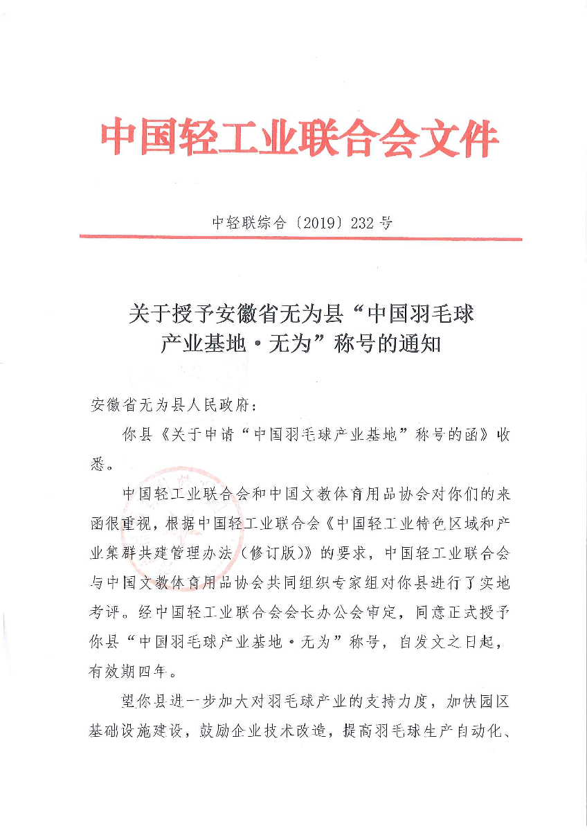 关于授予安徽省无为县“中国羽毛球产业基地·无为”称号的通知