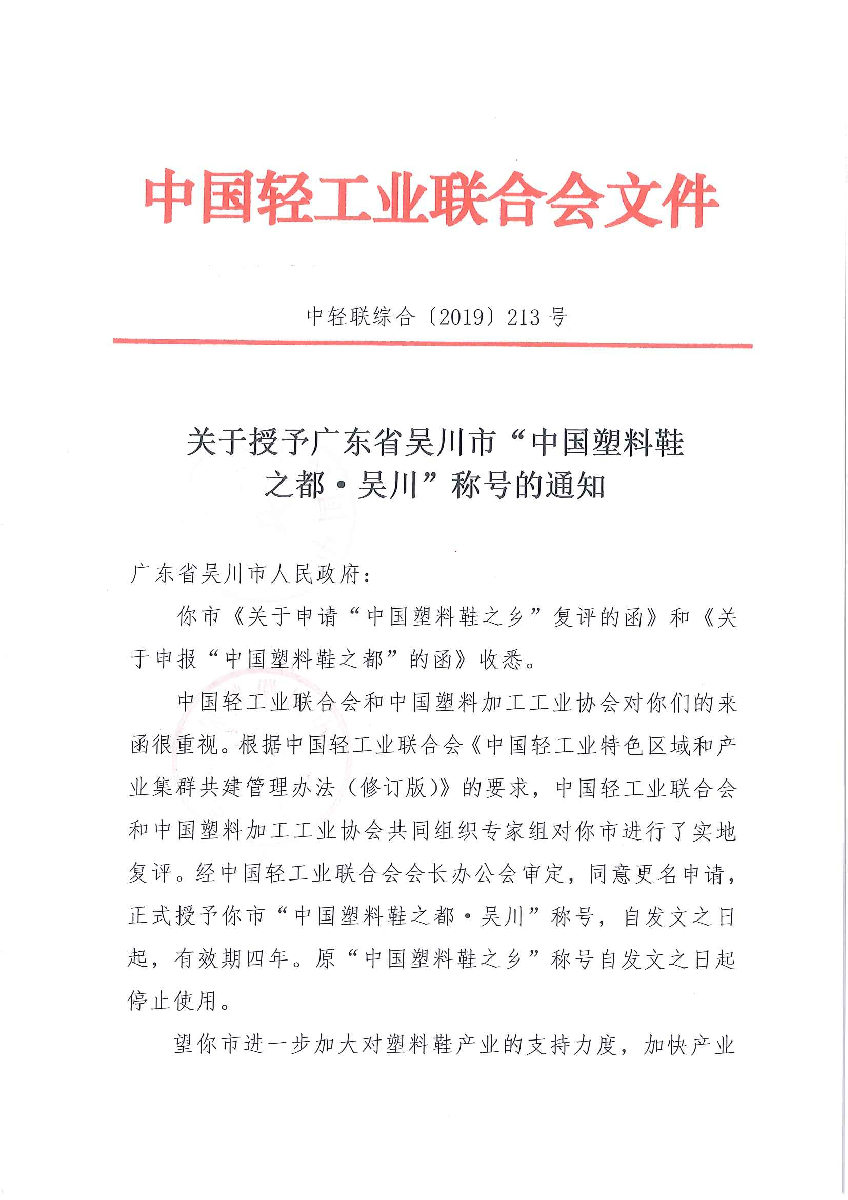 关于授予广东省吴川市“中国塑料鞋之都·吴川”称号的通知