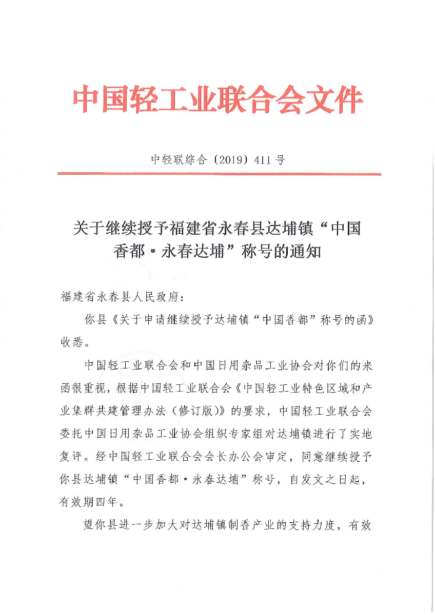 关于继续授予福建省永春县达埔镇“中国香都·永春达埔”称号的通知