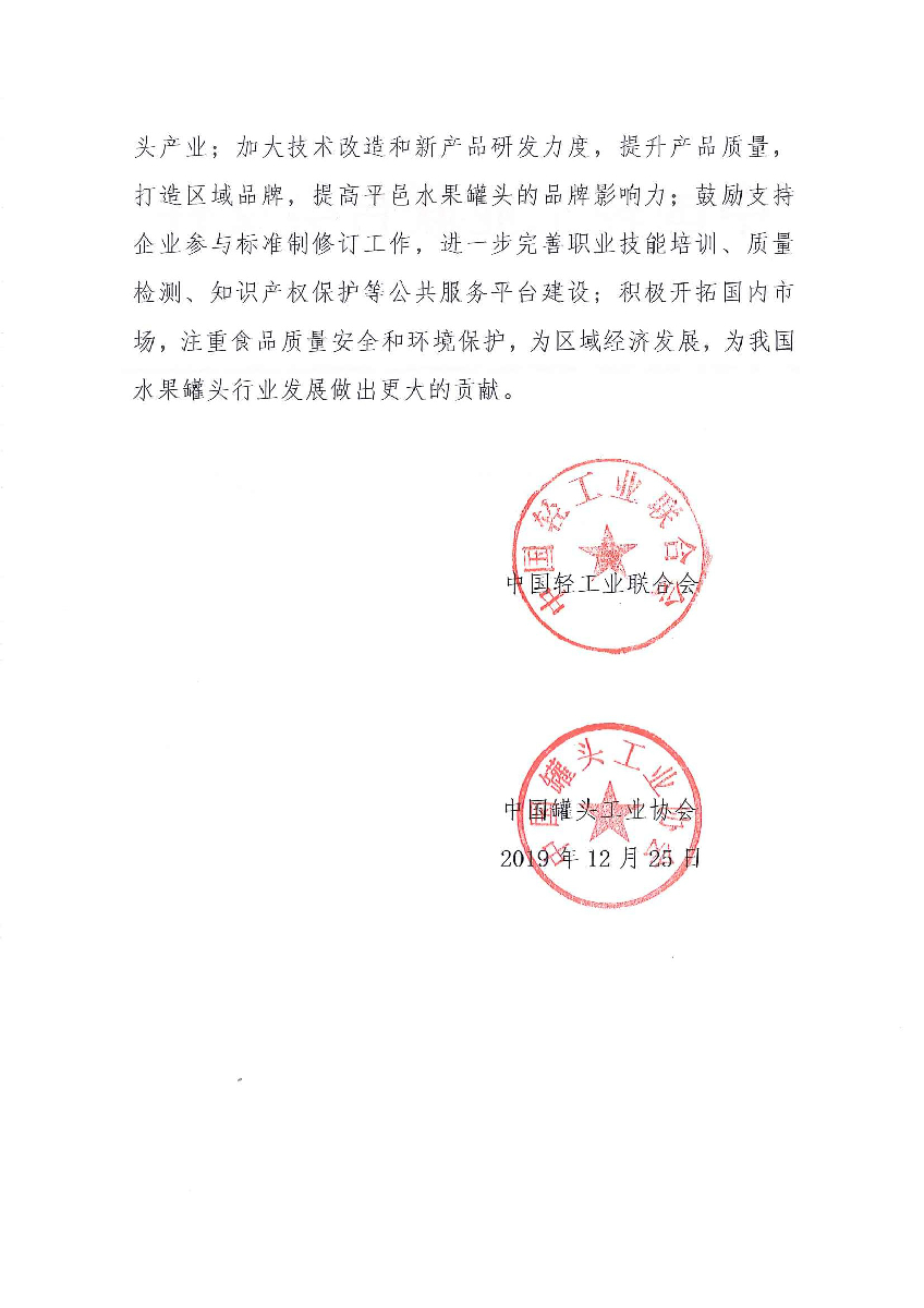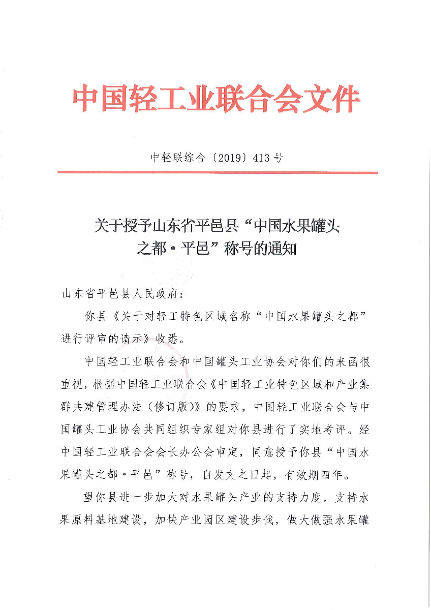 关于授予山东省平邑县“中国水果罐头之都·平邑”称号的通知