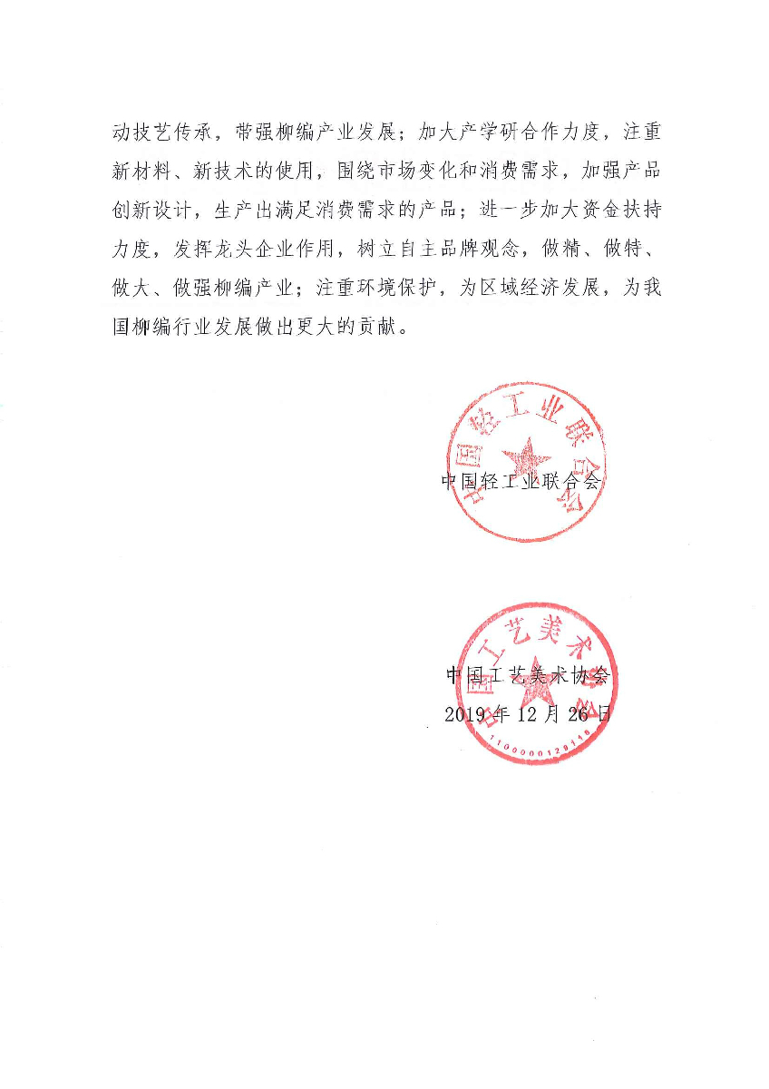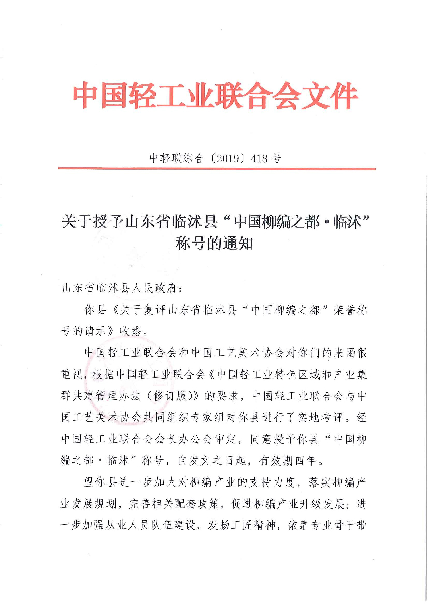 关于授予山东省临沭县“中国柳编之都·临沭”称号的通知