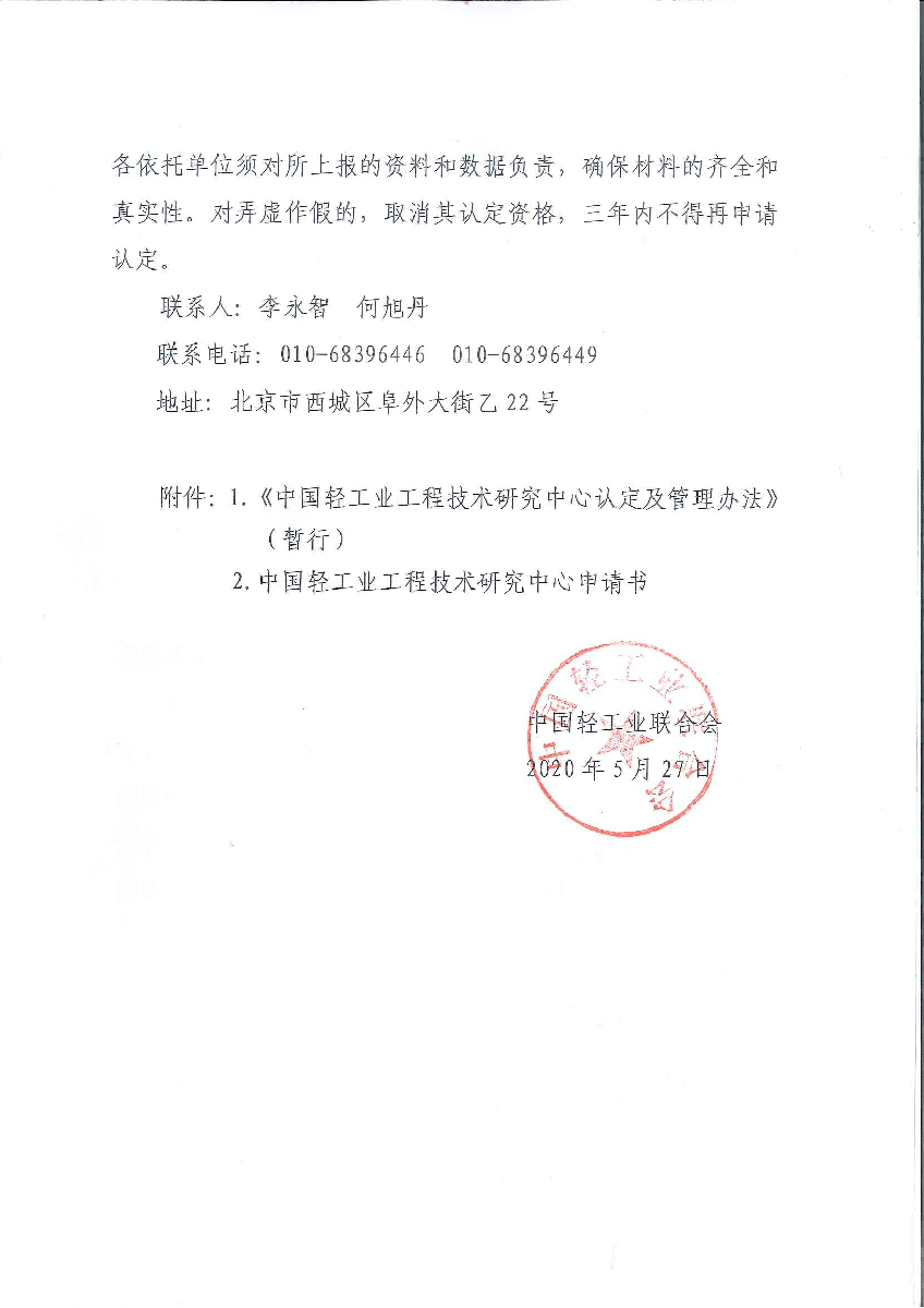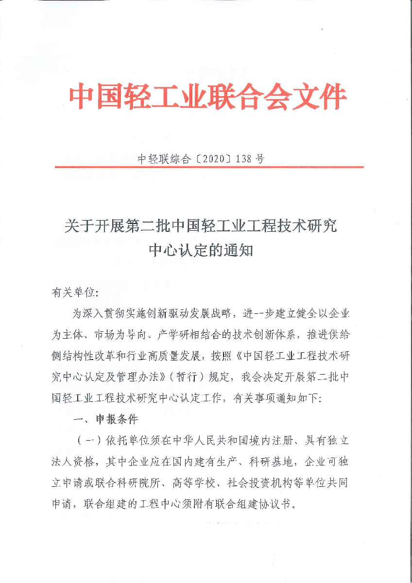 关于开展第二批中国轻工业工程技术研究中心认定的通知