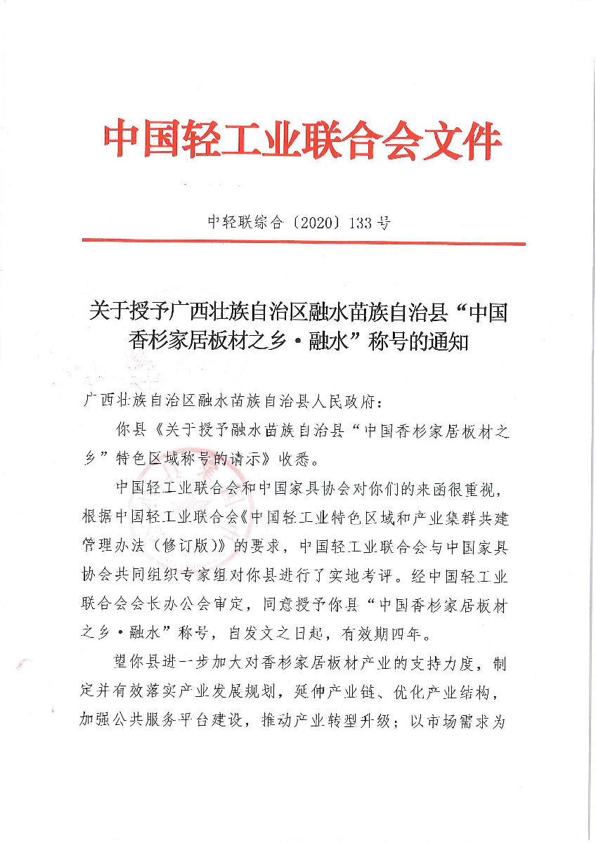 关于授予广西壮族自治区融水苗族自治县“中国香杉家居板材之乡·融水”称号的通知