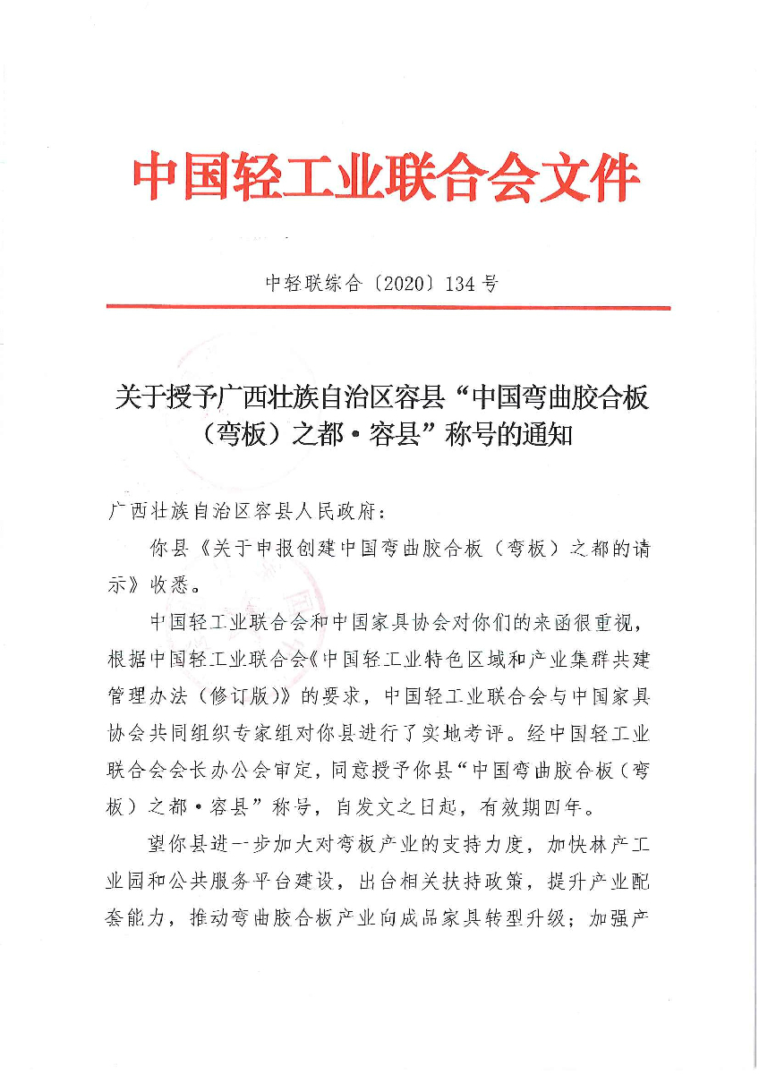 关于授予广西壮族自治区容县“中国弯曲胶合板(弯板)之都·容县”称号的通知
