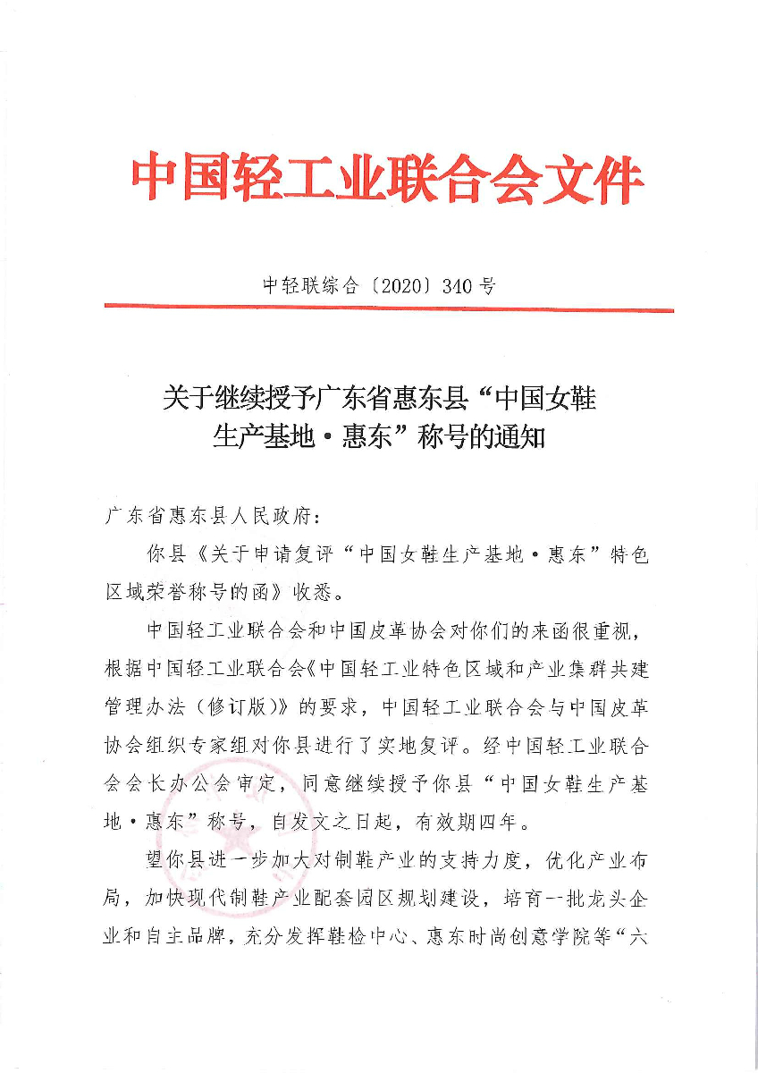 关于继续授予广东省惠东县“中国女鞋生产基地·惠东”称号的通知