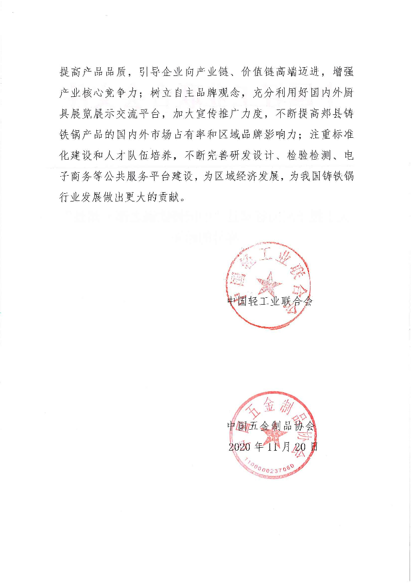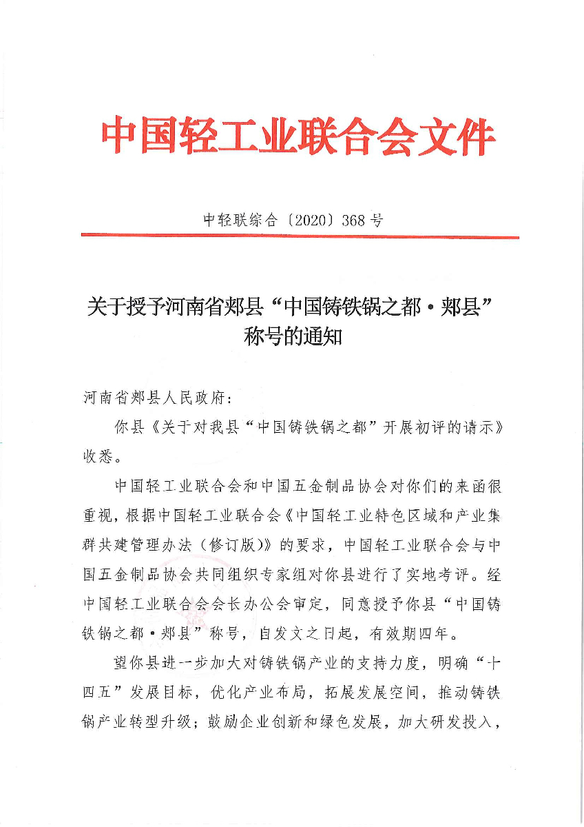 关于授予河南省郏县“中国铸铁锅之都·郏县”称号的通知