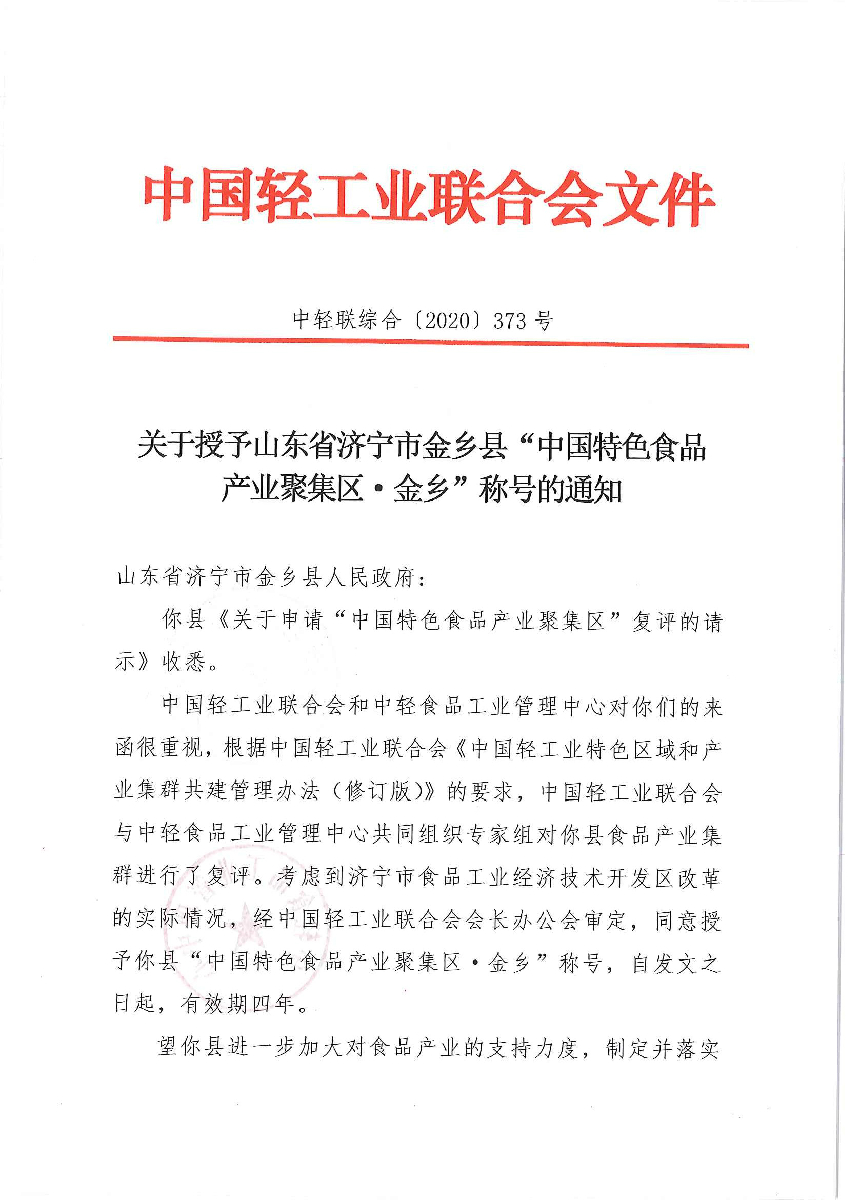 关于授予山东省济宁市金乡县“中国特色食品产业聚集区·金乡”称号的通知
