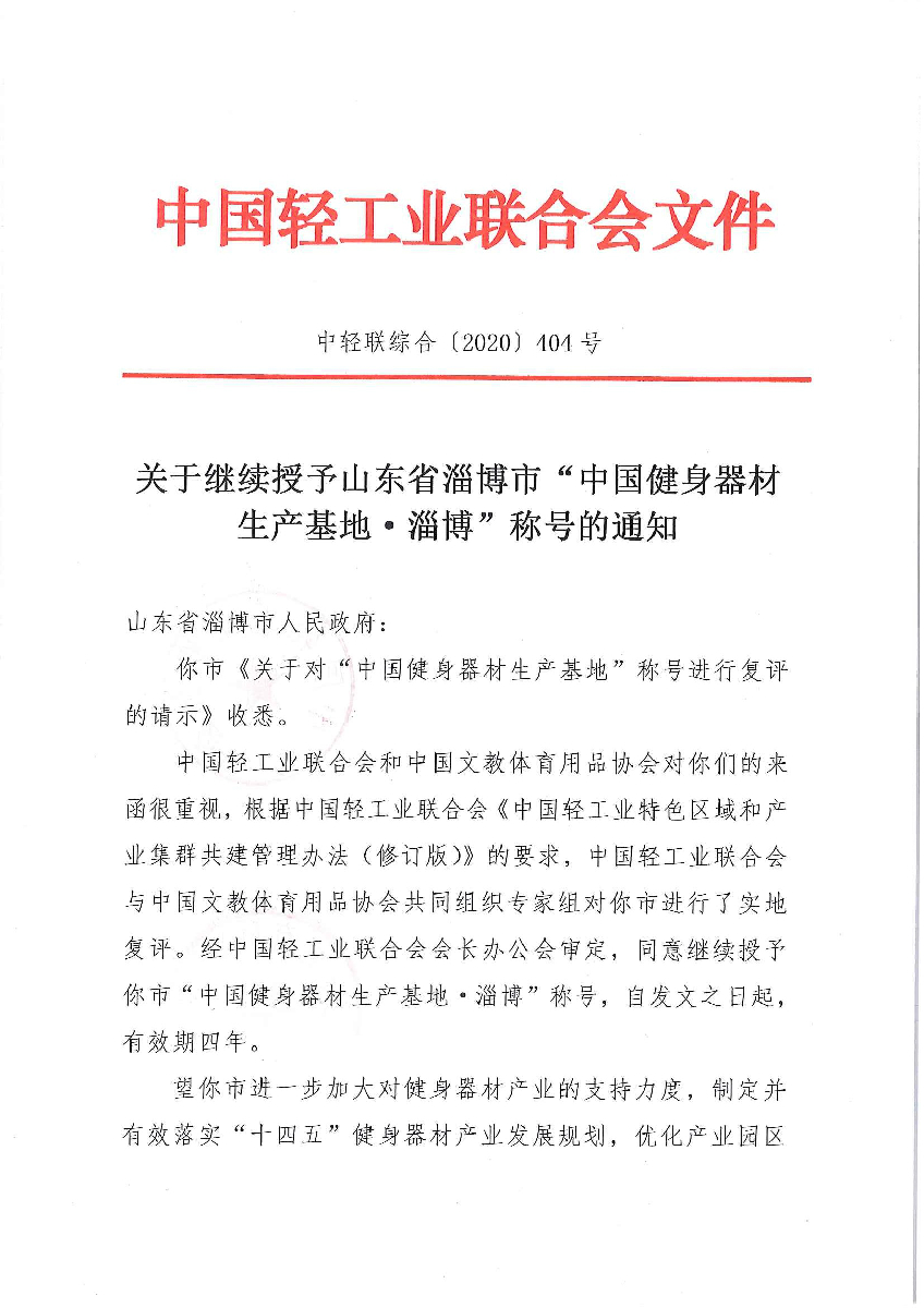 关于继续授予山东省淄博市“中国健身器材生产基地·淄博”称号的通知