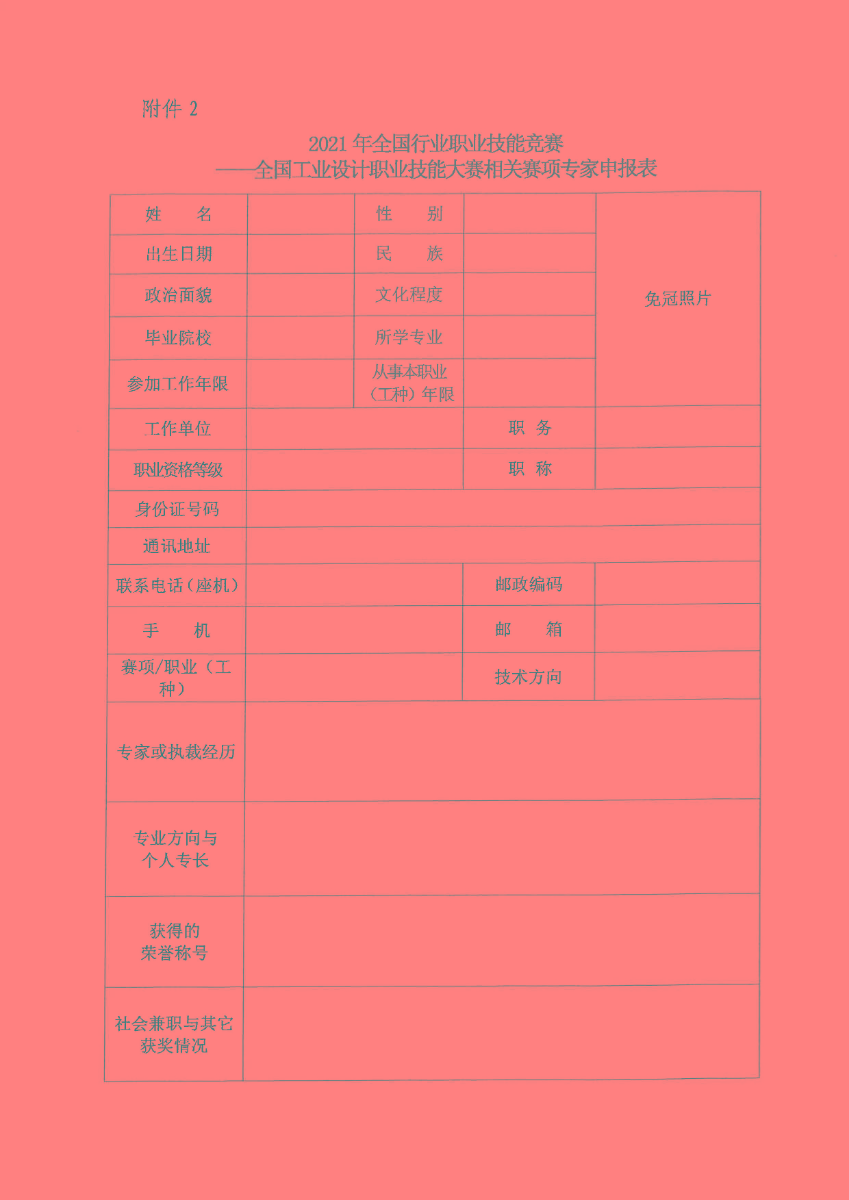 2021年全国行业职业技能竞赛 ——全国工业设计职业技能大赛相关赛项专家申报表