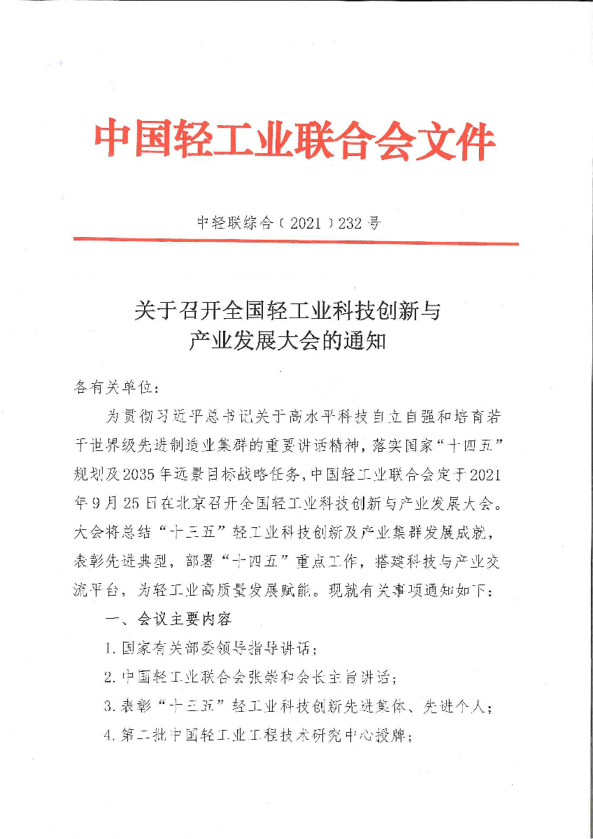 关于召开全国轻工业科技创新与产业发展大会的通知