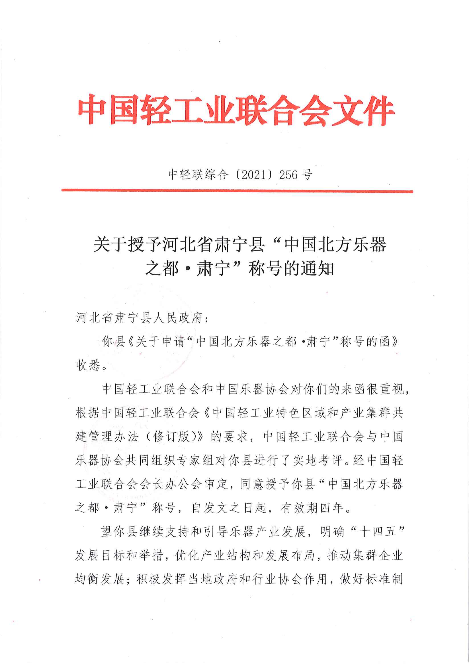 关于授予河北省肃宁县“中国北方乐器之都·肃宁”称号的通知