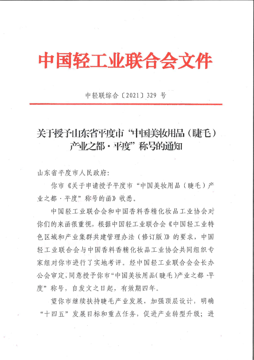 关于授予山东省平度市“中国美妆用品(睫毛)产业之都·平度”称号的通知
