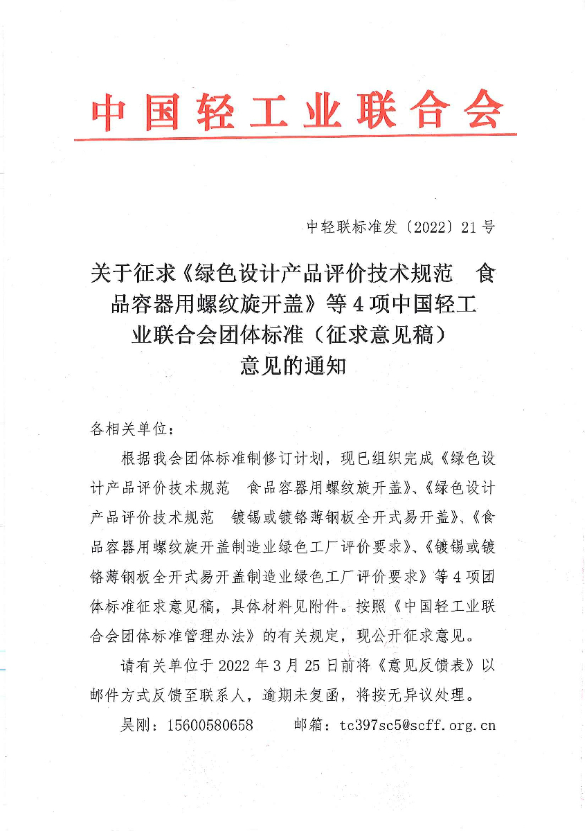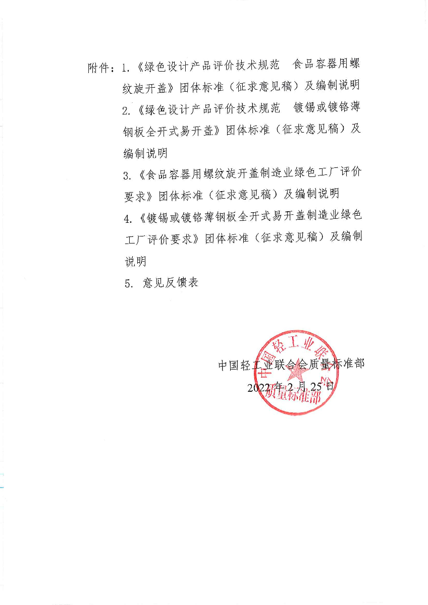 | 1、 | 1-《绿色设计产品评价技术规范 食品容器用螺纹旋开盖》团体标准(征求意见稿) |