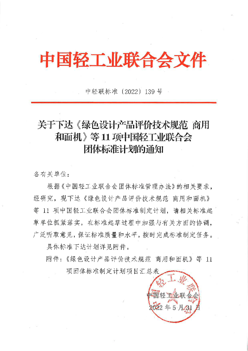 关于下达《绿色设计产品评价技术规范 商用和面机》等11项优米app下载直播团体标准计划的通知