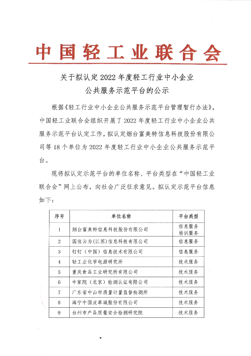 关于拟认定2022年度轻工行业中小企业公共服务示范平台的公示