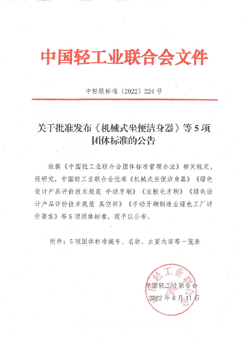 关于批准发布《机械式坐便洁身器》等5项团体标准的公告