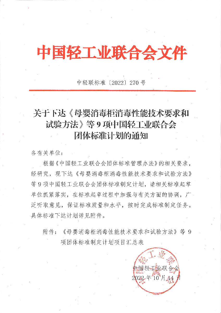 关于下达《母婴消毒柜消毒性能技术要求和试验方法》等9项优米app下载直播团体标准计划的通知