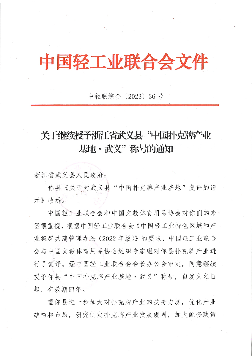 关于继续授予浙江省武义县“中国扑克牌产业基地·武义”称号的通知