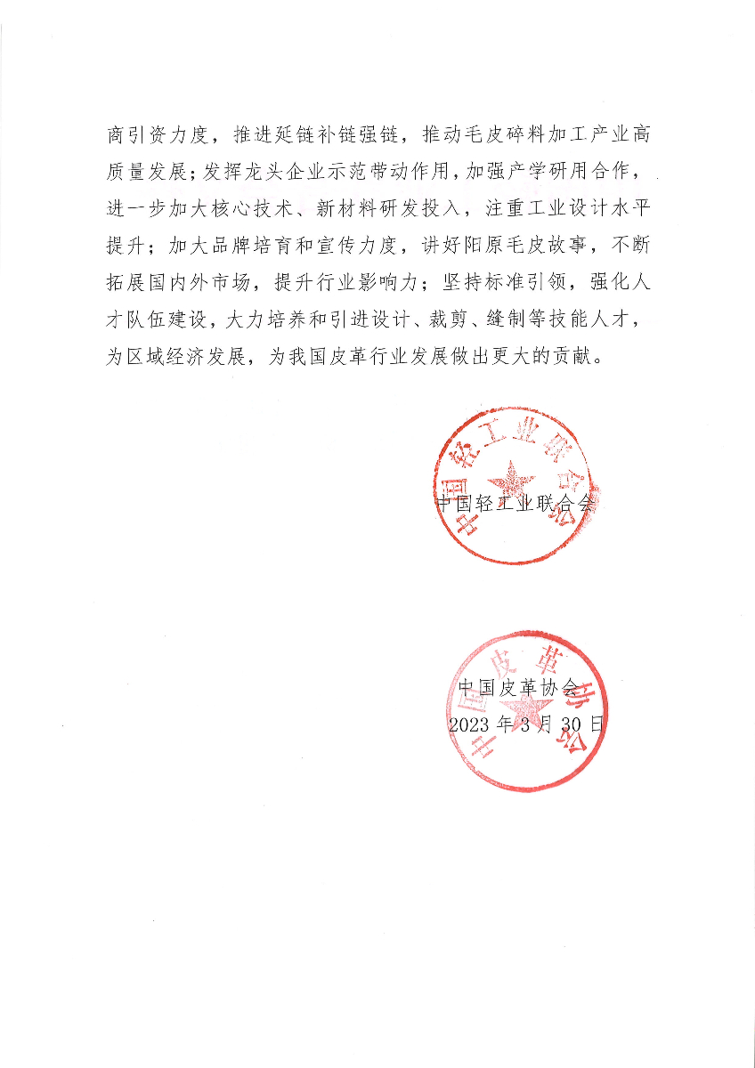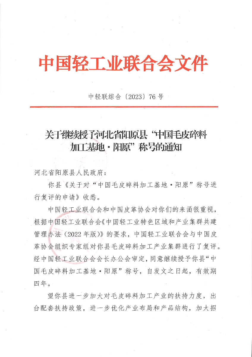 关于继续授予河北省阳原县“中国毛皮碎料加工基地·阳原”称号的通知