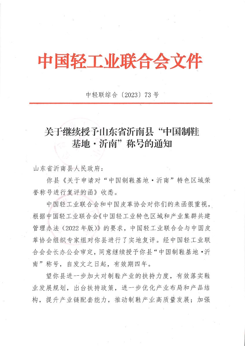 关于继续授予山东省沂南县“中国制鞋基地·沂南”称号的通知