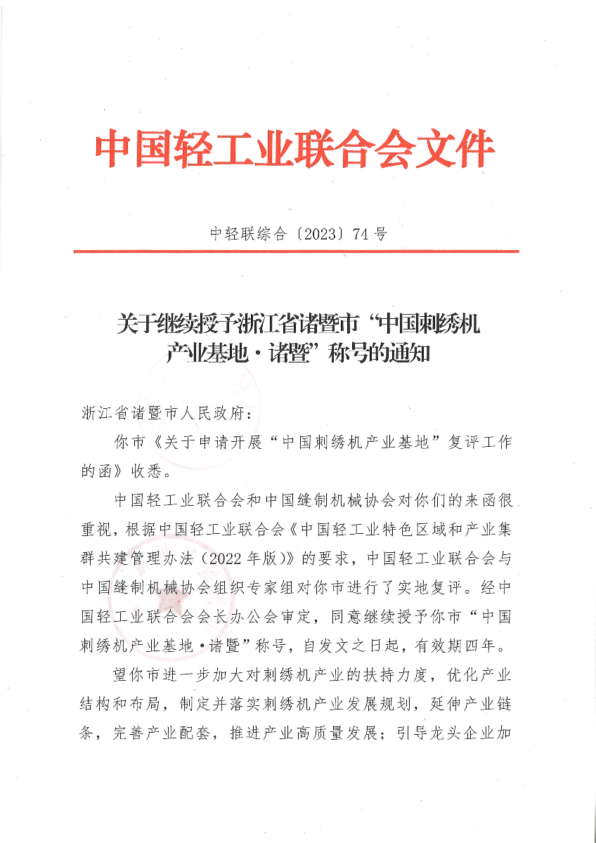 关于继续授予浙江省诸暨市“中国刺绣机产业基地·诸暨”称号的通知