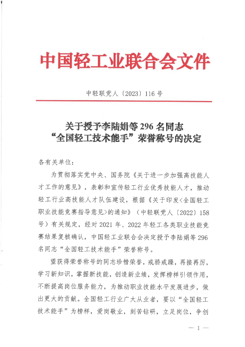 关于授予李陆娟等296名同志“全国轻工技术能手”荣誉称号的决定.pdf