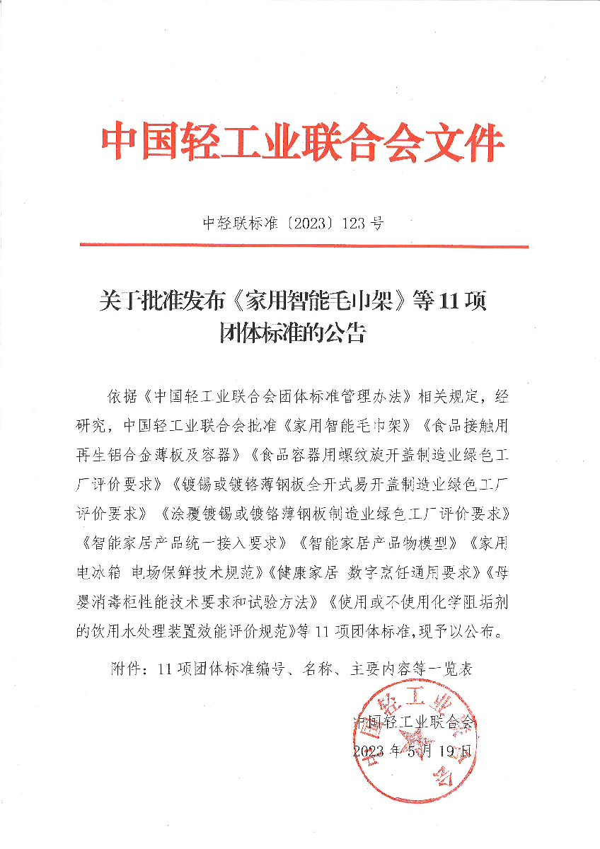 关于批准发布《家用智能毛巾架》等11项团体标准的公告