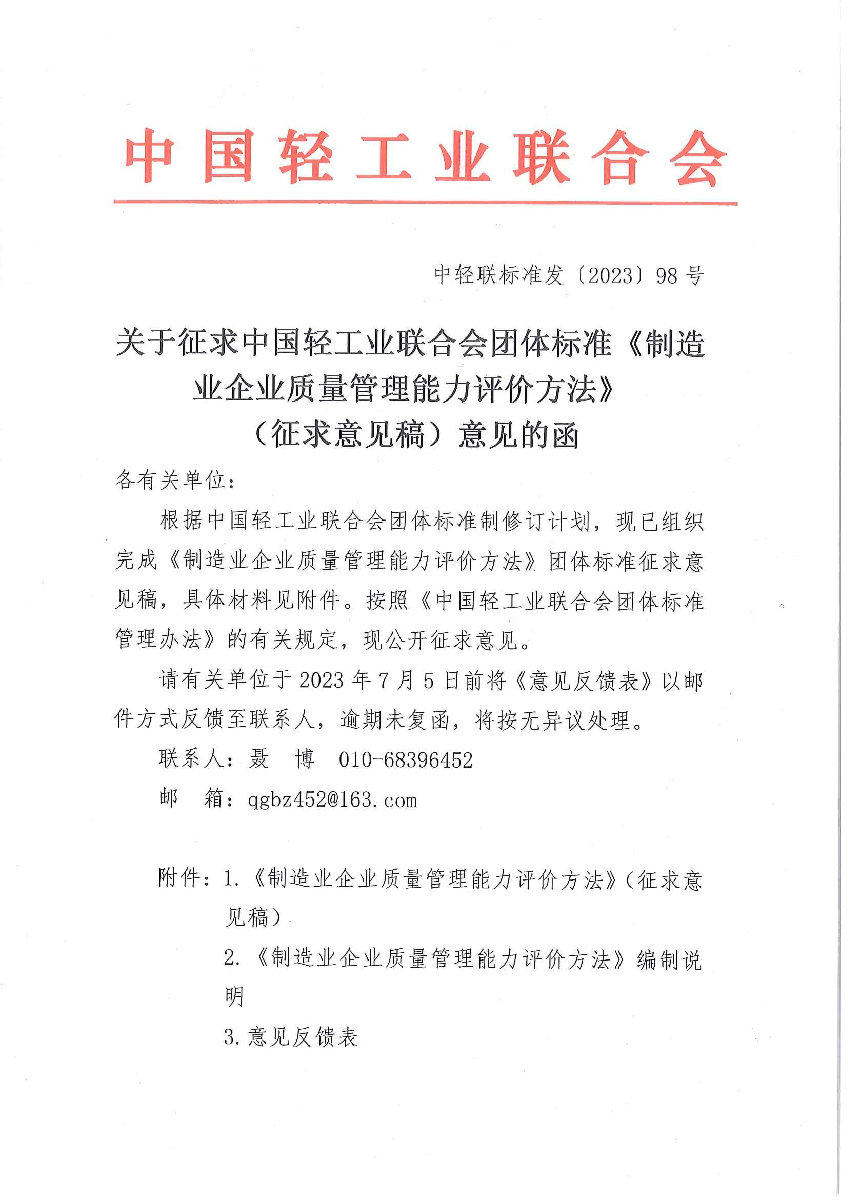 关于征求优米app下载直播团体标准《制造业企业质量管理能力评价方法》(征求意见稿)意见的函