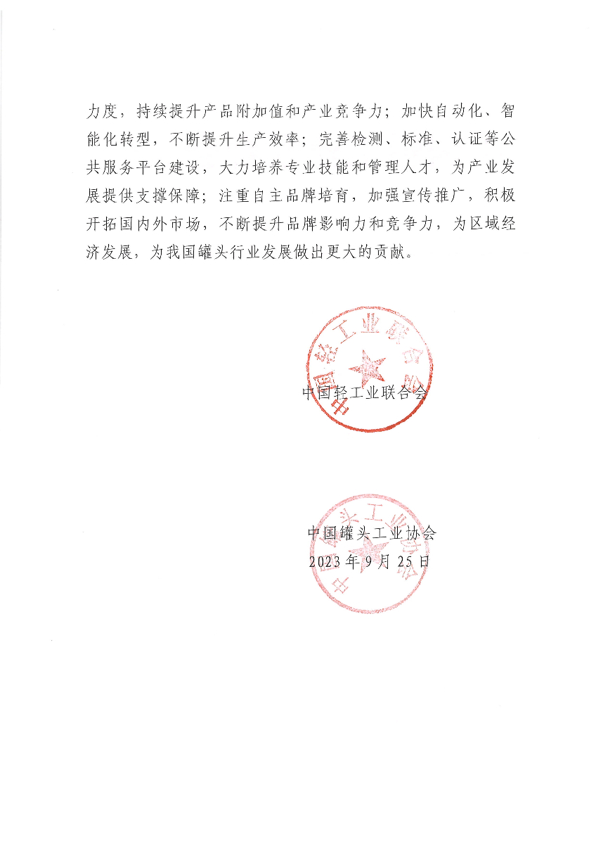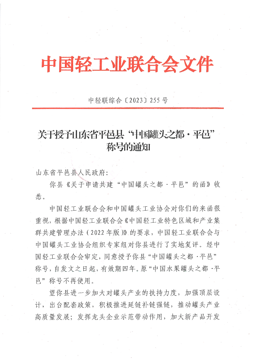关于授予山东省平邑县“中国罐头之都·平邑”称号的通知