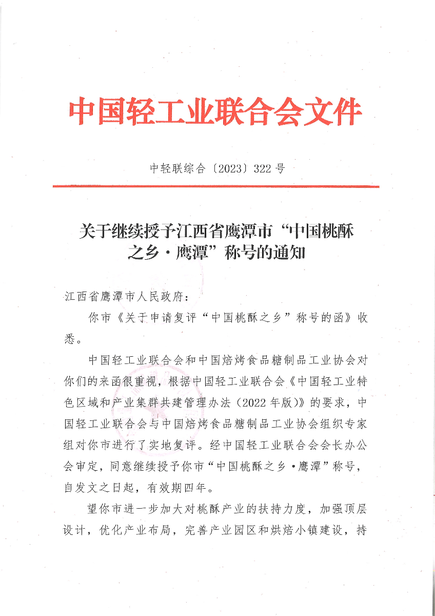 关于继续授予江西省鹰潭市“中国桃酥之乡·鹰潭”称号的通知