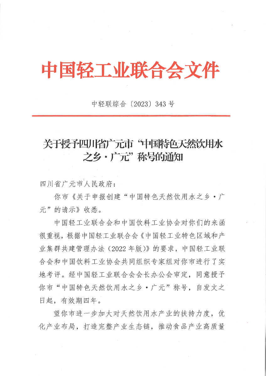 关于授予四川省广元市“中国特色天然饮用水之乡·广元”称号的通知