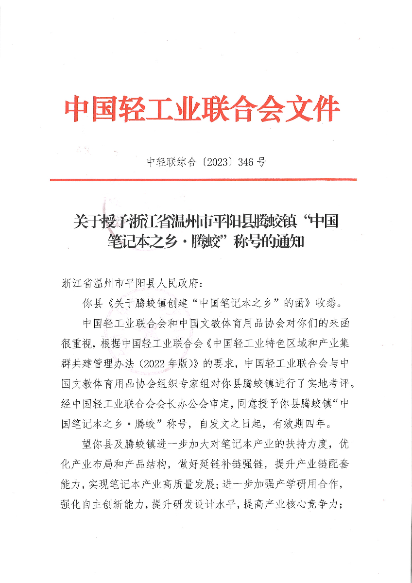 关于授予浙江省温州市平阳县腾蛟镇“中国笔记本之乡·腾蛟”称号的通知