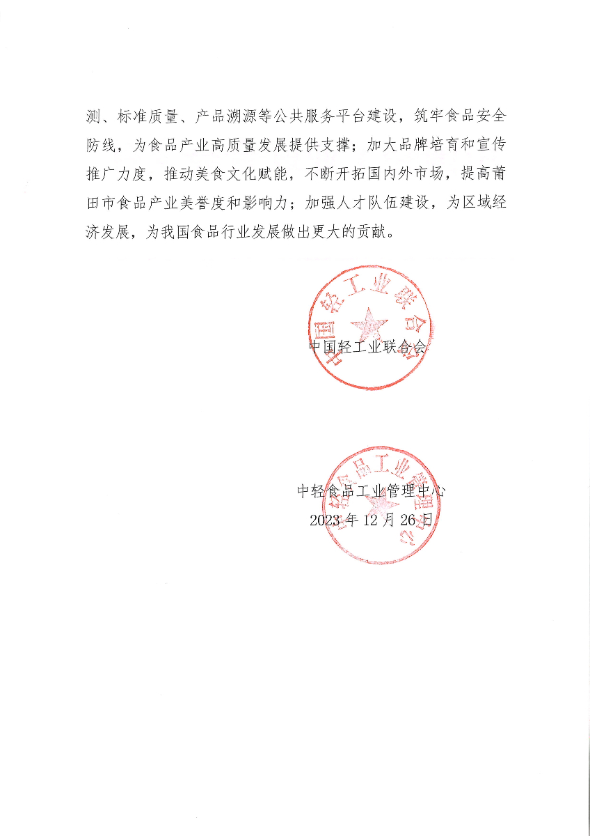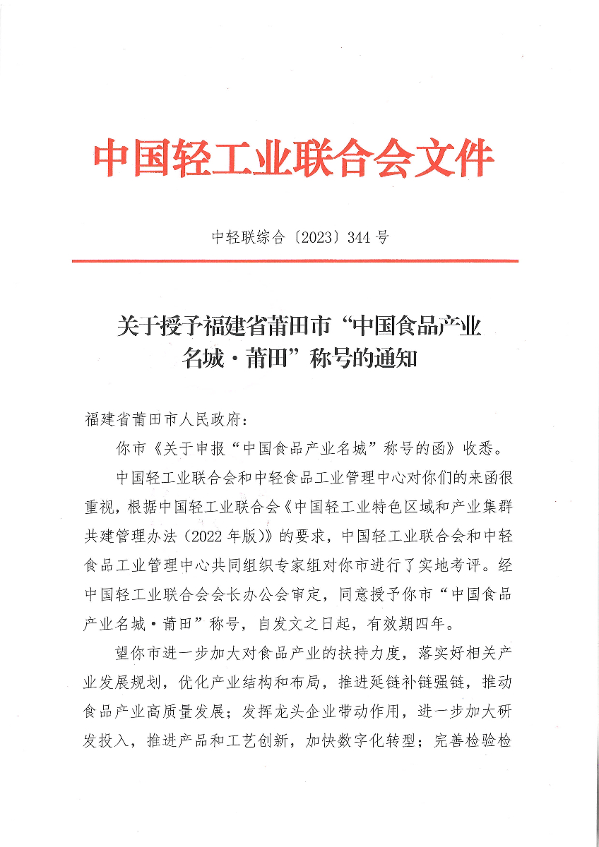 关于授予福建省莆田市“中国食品产业名城·莆田”称号的通知